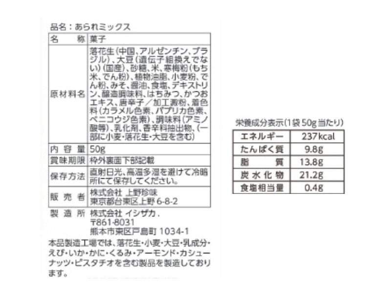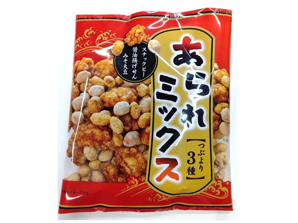 特徴:粒よりな3種(みそ大豆・醬油揚げせん・スナックピーナッツ)をミックスしました。