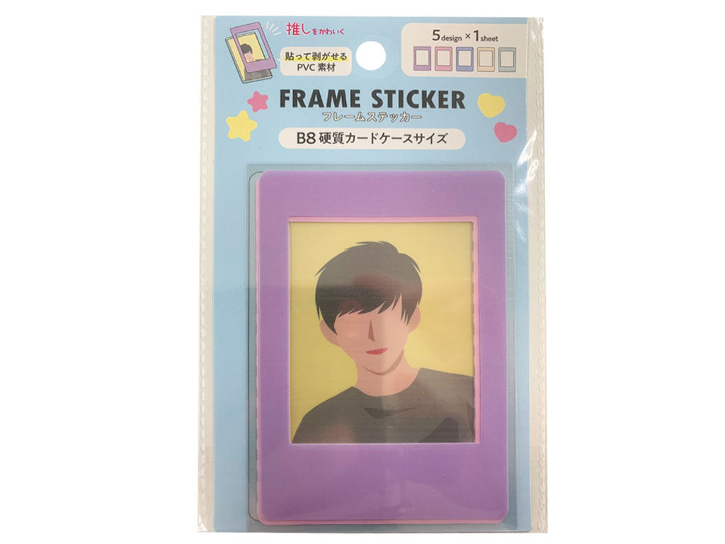 サイズ縦10x横7cm。貼って剥がせる硬質カードケースB8サイズのフレームステッカーです。全5柄。カードケース用シールです。貼って剥がせる硬質カードケースB8サイズのフレームステッカーです。全5柄。カードケース等に貼って使用します。●直射日光・高温多湿の場所を避けて、保管してください。●お子様の手の届かない場所に保管してください。剥離紙からはがす際は十分気をつけてください。本商品の取り外し時には、糊残りや貼り付け面の塗装のはがれの可能性があります。肌には絶対貼らないでください。●お子様の手の届かない場所で使用・保管してください。