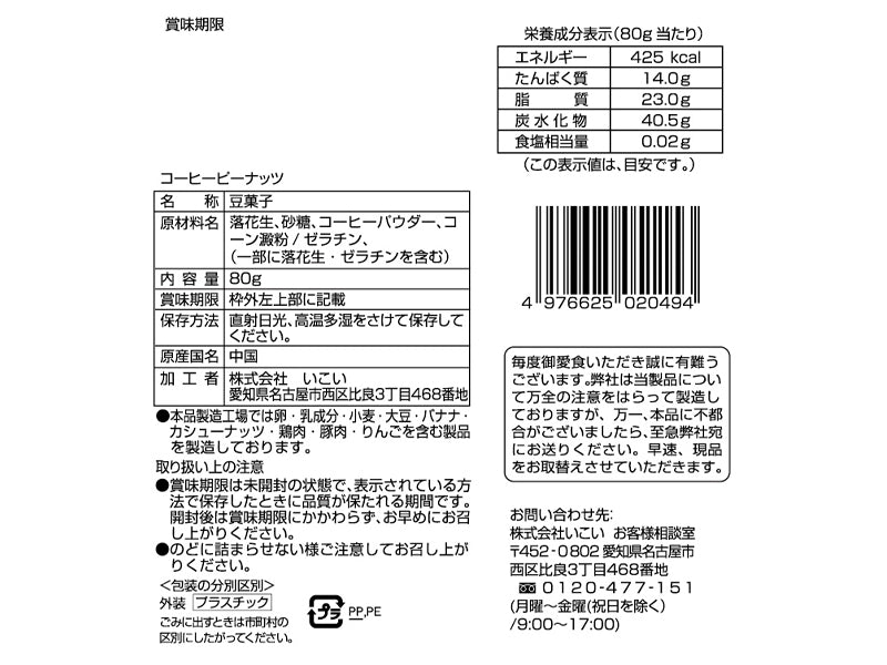 特徴:ピーナッツの素材を生かしながら香り豊かなコーヒーで味付け致しました