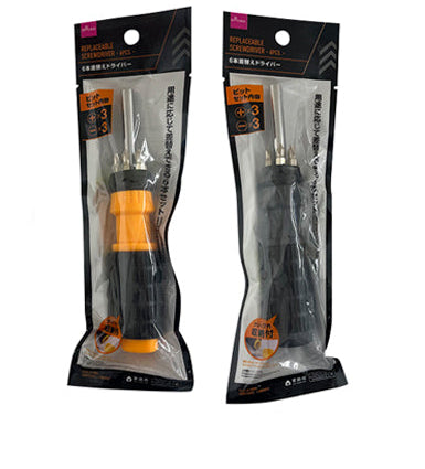 用途に応じて差替えできる6本セット差替え簡単マグネット式グリップ内収納付※写真はイメージです。(日本語のみ)家庭用(日・英のみ)簡単に抜けます。ビットセット内容 +×3 、-×3(日本語のみ)ビットサイズ直径約4.5mm、直径約5.5mm、直径約6mm、約4.5mm、約5.5mm、約6mmサイズを選んで差し込みます。ネジ穴に先端をしっかり合わせます。押し込むように力を入れながらネジを回してください。お子様の手の届かない場所に保管してください。使用する際は多少の慣れが必要です。使い方によってはケガ・破損の原因となります。軸芯の取付・交換の際は、きちんと装着されているか確認してください。非絶縁工具です、電化製品を扱う際は、必ず電源を切ってから作業してください。先端で手や指をケガしないように、十分注意してください。磁気に影響を受けるものに近づけないでください。変形・破損した場合、直ちに使用を中止してください。火や熱源のそばに置かないでください。本来の用途以外に使用しないでください。申し訳ございません。生産には万全を期しておりますが、万一不良品の場合にはお買い上げ店にてお取り替えさせていただきます。本品の欠陥に基づかない損害、または本品使用目的以外により生じた損害については当社では負いかねます。あらかじめご了承の上お買い求めください。(日本語のみ)