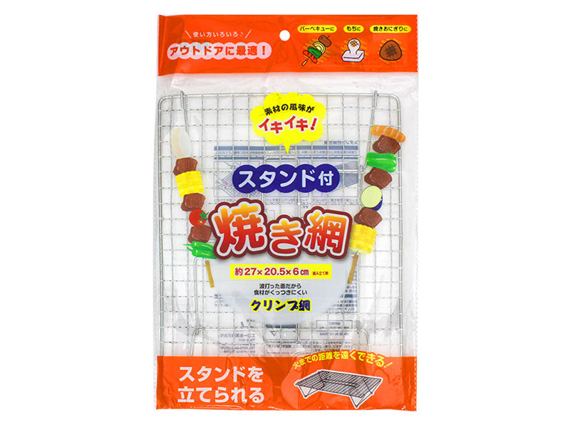 使い方いろいろ アウトドアに最適! 素材の風味がイキイキ!バーベキューに もちに 焼きおにぎりに約27×20.5×6cm(組み立て時) 波打った面だから食材がくっつきにくいクリンプ網 スタンドを立てられる 火までの距離を遠くできる!エッジ部で手指を傷つけないように注意しながら、袋から出します。 フック部が付いている面を上にした状態で、スタンド部を立ち上げます。 スタンド部をフック部まで引きつけて掛けます。 ご使用の際はスタンド部を下にして使用してください。 フック部にしっかりはまっていることを確認してください。●材質の特性上、サビが発生する場合があります。サビが発生した場合は、金属ブラシなどでこすり落としてください。 ●異種金属と接触させたまま放置しないでください。サビの発生原因となります。小さなお子様の手の届かない場所に保管してください。●製造の都合上、鋭利な部分があります。使用および洗浄の際は指などにケガをしないよう十分気をつけてください。 ●初めて使用する際は、必ずカラ焼きをしてください。この時、サビ止め油(衛生上の害はありません)が燃えて臭気がこもる場合がありますので、必ず換気を行ってください。 ●調理中、網は大変熱くなりますので軍手や鍋つかみなどを使用してください。また、調理直後に素手で触らないでください。 ●本来の用途以外には使用しないでください。 ●火のそばに放置しないでください。 ●使用前に必ず破損などがないか確認してください。 ●安定させた状態で使用してください。 ●重い物や鍋・釜などはのせないでください。破損の原因となります。 ●使用前後は食器用洗剤でよく洗い、乾燥させてから使用・保管してください。 ●本製品は家庭用の食器洗浄機・乾燥機で使用できません。 ●タワシや磨き粉で洗うとキズがつくことがあります。 ●無理な力や強い衝撃を加えないでください。 ●改造や修理をしないでください。