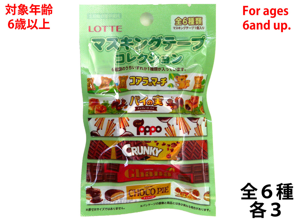 6種類のうちいずれか1種類が入っています。 ※原寸大サイズではありません。 ※パッケージの画像と商品とは多少異なる場合があります。 全6種類 マスキングテープ1個入り サイズ:幅15mmx長さ3m ●対象年齢6才以上 ●子どもの手の届かない場所で使用・保管 ●肌に貼らない ●直射日光・高温多湿を避け使用・保管 ●貼る材質により、糊残りやはがし跡が残る場合あり ●接着面のホコリ・油分・水分を拭き取って使用